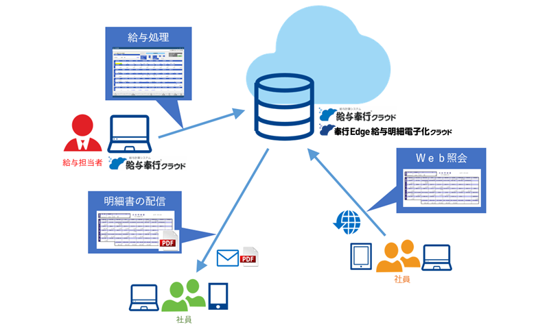例えば、奉行Edge 給与明細電子化クラウドは、給与奉行iクラウドと連携し、給与データを明細の形で電子交付できるサービスです。給与明細書だけでなく、賞与明細書や源泉徴収票、年末調整通知書など、さまざまな帳票をWeb照会またはメール配信で提供できます。どちらも同じ奉行iクラウドの統合環境で運用するため、給与業務全体を正確・効率的に回し続ける体制が整備しやすくなります。