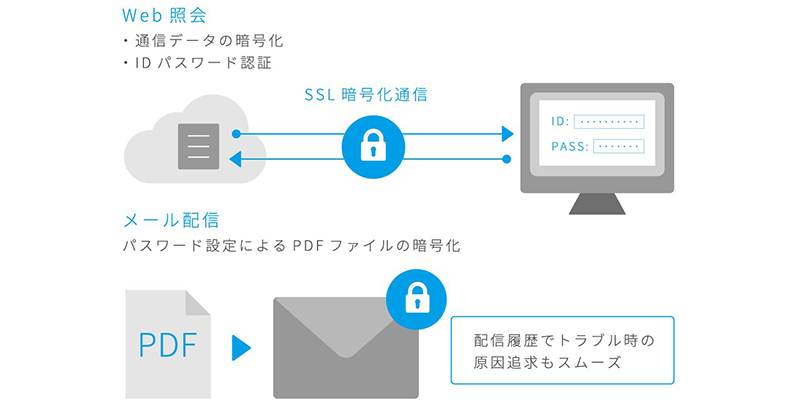 奉行iクラウド独自のセキュリティ対策により、Web照会・メール配信それぞれに応じた保護措置が講じられており、改ざん防止機能も備えています。