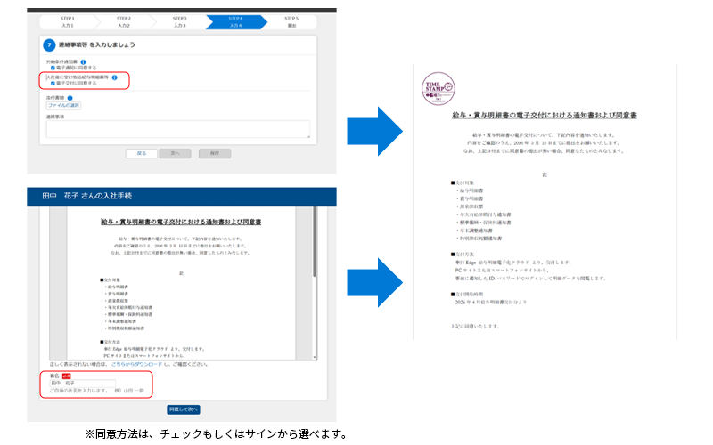 また、奉行Edge 労務管理電子化クラウドを併用すれば、入社手続きと合わせて同意を得ることも可能です。