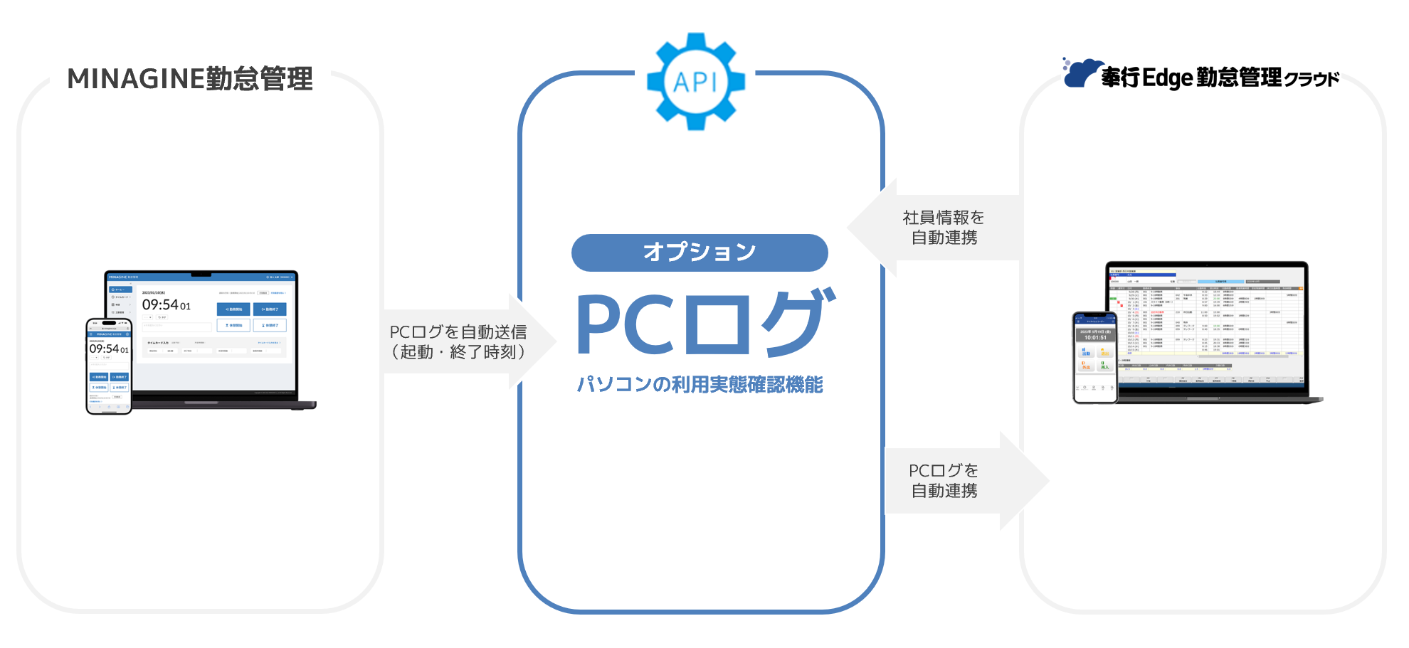 「ミナジンのPCログデータ」と自動連携することで、「奉行Edge勤怠管理クラウド」で打刻した勤怠データとの乖離を外部突合の手間なく把握でき、客観的な労働時間の管理をすることができます。