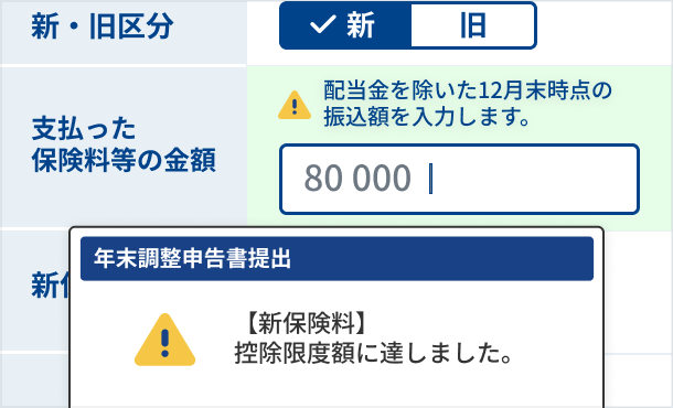 控除額の自動計算や、控除上限額のアラート機能など、入力ミスを防ぐ機能によって、ミスのない申告を実現します。