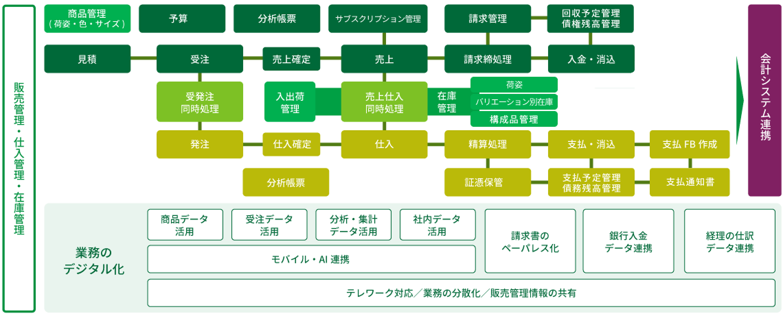 属人化・複雑化しやすい売上・仕入・在庫管理の業務において、標準的な業務プロセスをワンパッケージで提供します。
