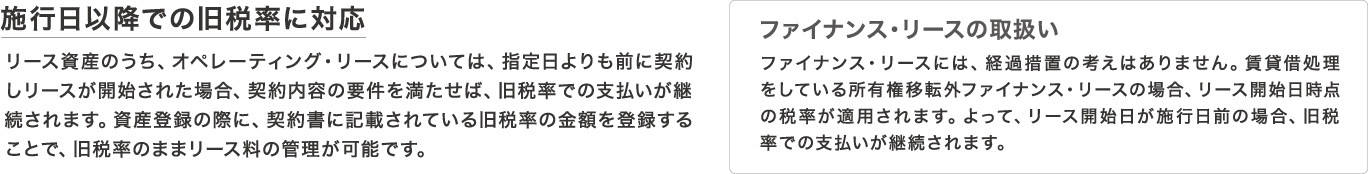 - 画面や帳票での税率表示により、確認の効率化や正確な支払リース料管理を実現
