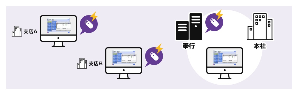 OBCセキュアアクセスキーがあれば、遠隔拠点のPCと本社のサーバーを安全なネットワークで接続でき、同じ奉行シリーズを共用できます。