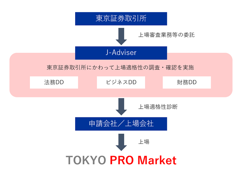 TOKYO PRO Market(東京プロマーケット)では、他の一般市場と違い数値基準等の形式基準が存在しません。代わりに東証から上場審査業務等を委託されたJ-Adviserが上場適格性要件を満たしているか確認します。