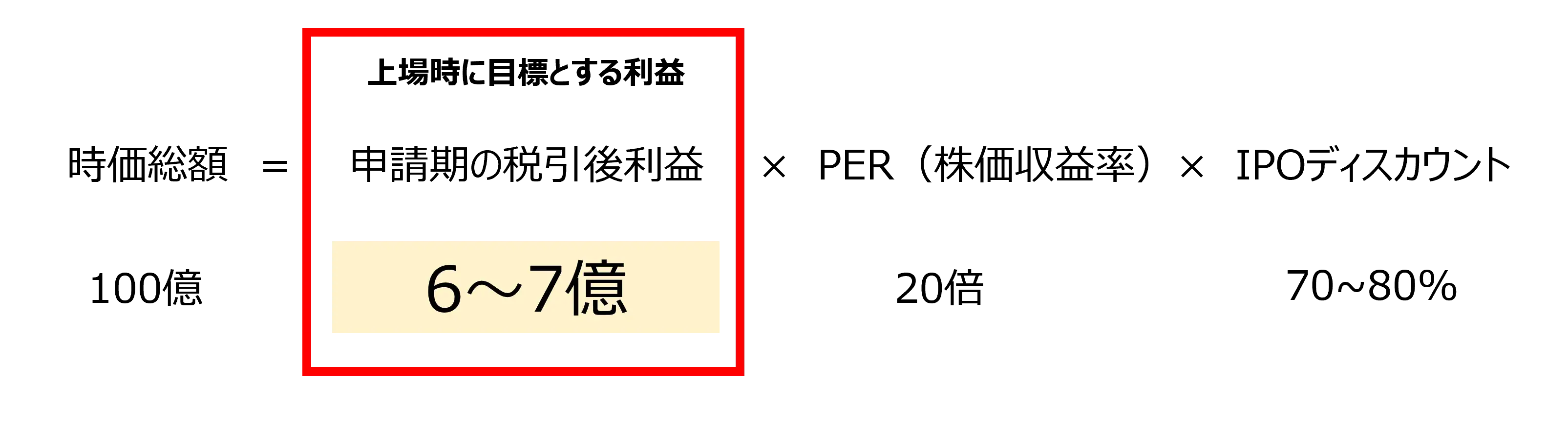 時価総額や業績は、『時価総額=申請期の税引後利益×PER(株価収益率)×IPOディスカウント(70~80%)』という算式から求めることができます。PERは業種やビジネスモデルによって異なりますが、今時点のマーケット平均が約20倍ですので、平均値で計算すれば、税引後利益が6億~7億程になれば100億円の時価総額が見込まれることになります。