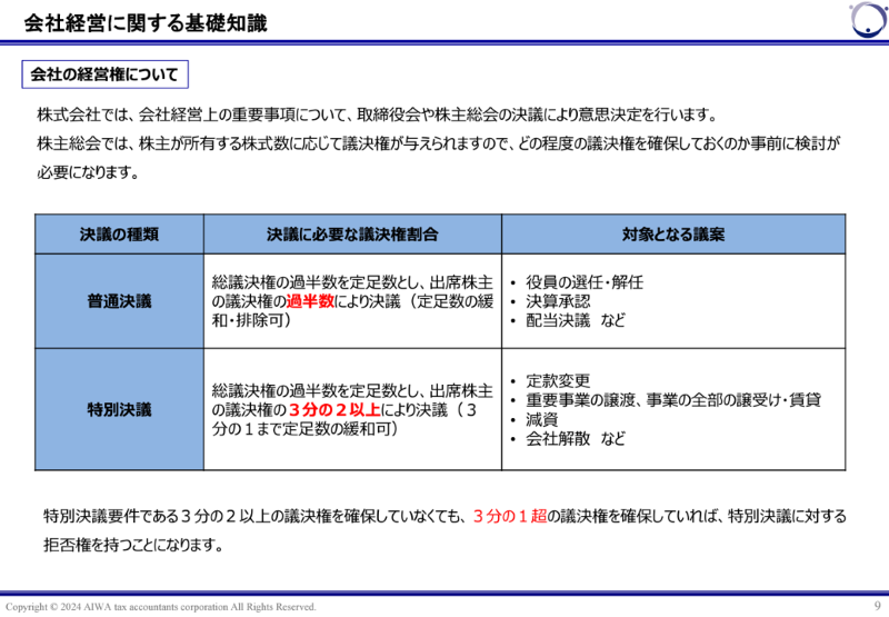 持株比率(議決権割合)によって、株主総会で決定権を持てる議案の範囲が決まります。株主総会の普通決議では過半数、特別決議では3分の2以上の議決権が必要です。オーナーが会社の経営権をどの程度維持しておきたいかによって持株比率を調整します。