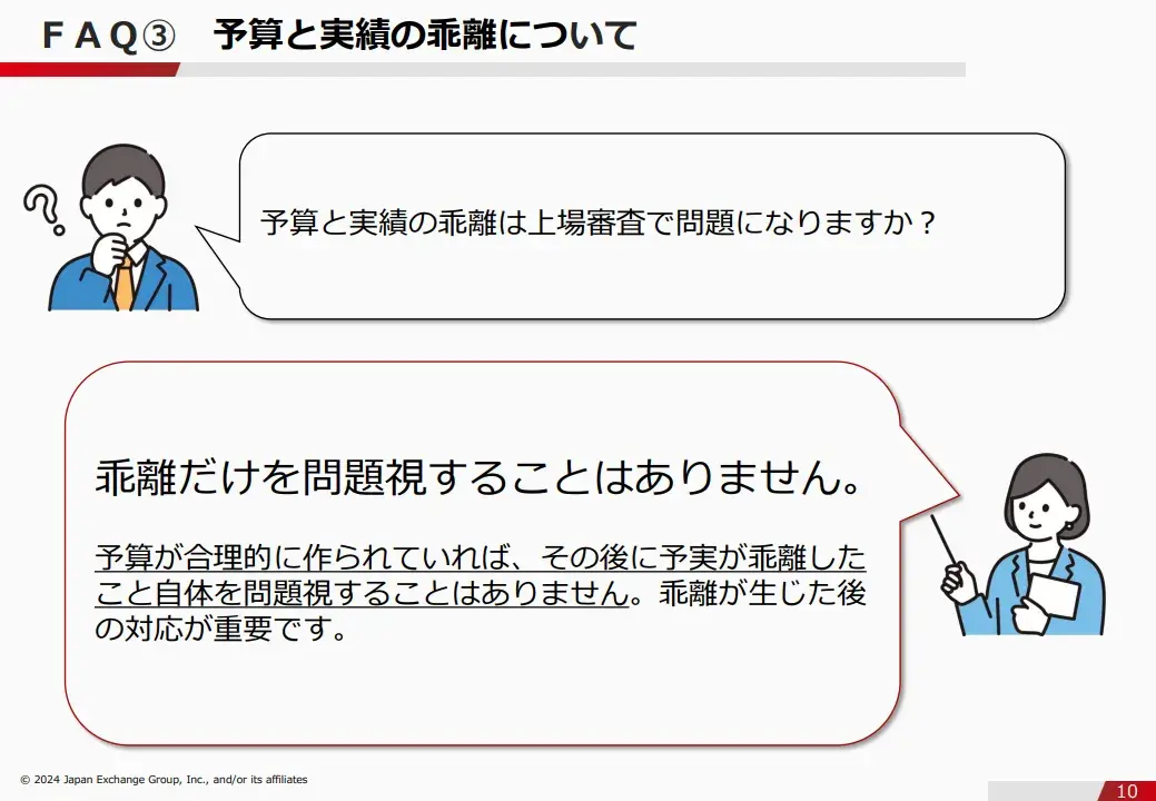 潮田一成(株式会社シンコペーション:以下、潮田) 2024年5月に公開した「上場審査のFAQ」にも明記されている通り、東証としては予実の乖離については問題にしていません。当然、予算というものは合理的に策定する必要はありますので、利益計画などは念入りに確認しています。しかし、予実がずれることは当然あることと理解しています。東証として、IPO時の業績開示をどうとらえているかというと、あくまでもこの先続く開示の1回目に過ぎないわけで、IPOの時だけ精緻な利益計画を作ってほしいと思っているわけではありません。当たるかはずれるか、ということではなくて、予実が乖離してしまったときに、その理由が分析でき、修正の必要があれば速やかに修正し開示する、この一連の流れがスムーズにできるかどうかを見ているのです。