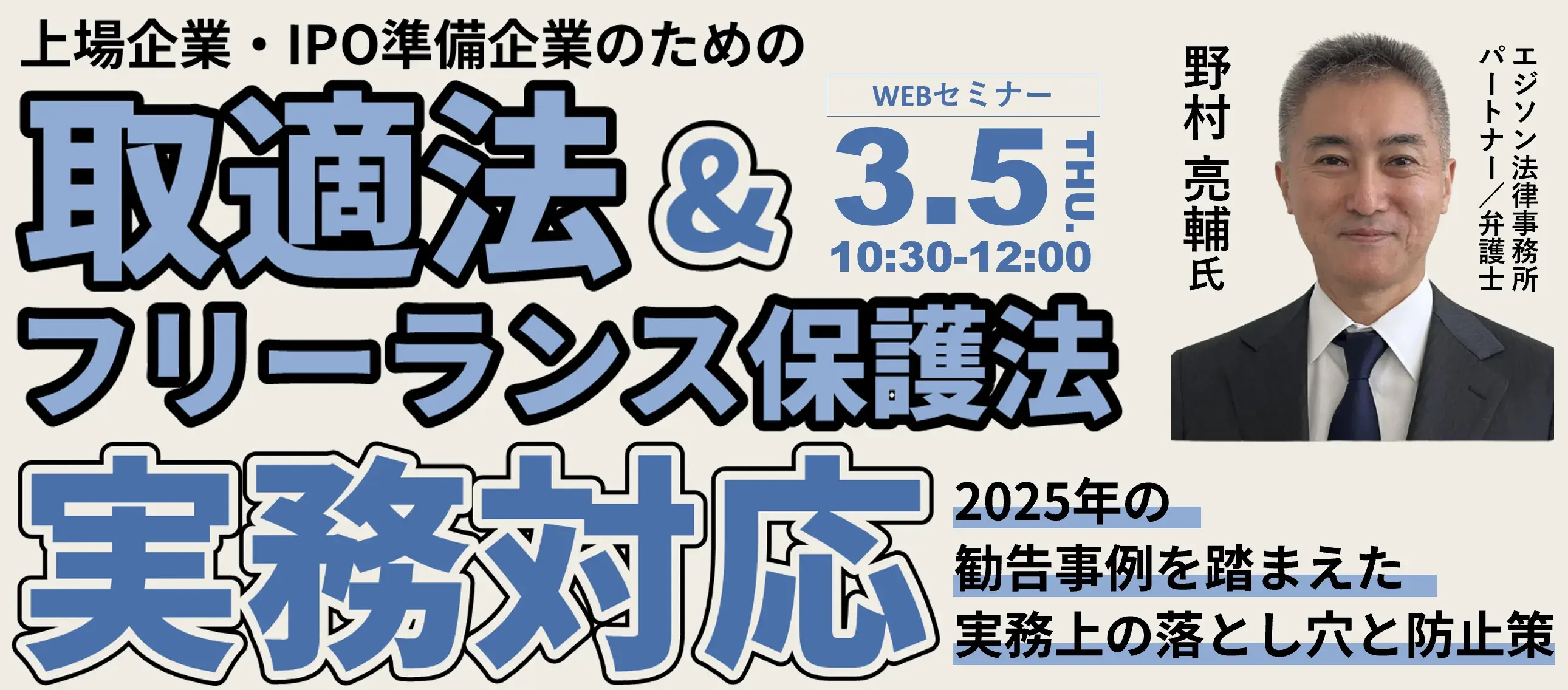 また、施行から1年が経過した「フリーランス保護法」も、出版・広告・メディア業を中心に勧告・行政指導が相次いでおり、上場企業およびIPO準備企業に求められる管理レベルは確実に上昇していると言えます。