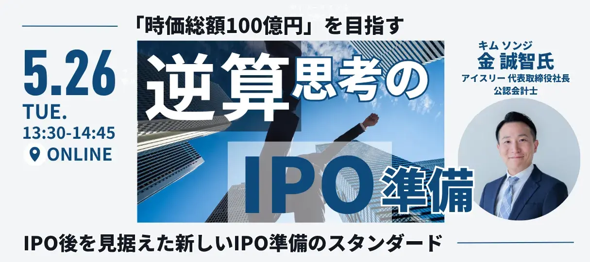 本セミナーでは、グローバルオファリングによるIPOの責任者として推進し、その後はIRオフィサーとして延べ1,000回を超える機関投資家とのIR面談を実施してきたアイスリー株式会社 金 誠智氏が、逆算思考のIPO準備について解説します。