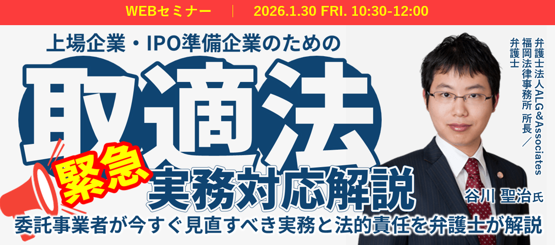 2026年1月より、「下請法」は「中小受託取引適正化法(取適法)」となり、規制が強化されます。フリーランス保護の流れを汲み、保護対象となる「受託事業者」の定義が拡大され、発注者(委託事業者)に課される義務もより厳格化・明確化されます。特に上場企業においては、違反時の企業名公表リスクやガバナンス上の影響が大きく、適切かつ正確な対応が求められます。